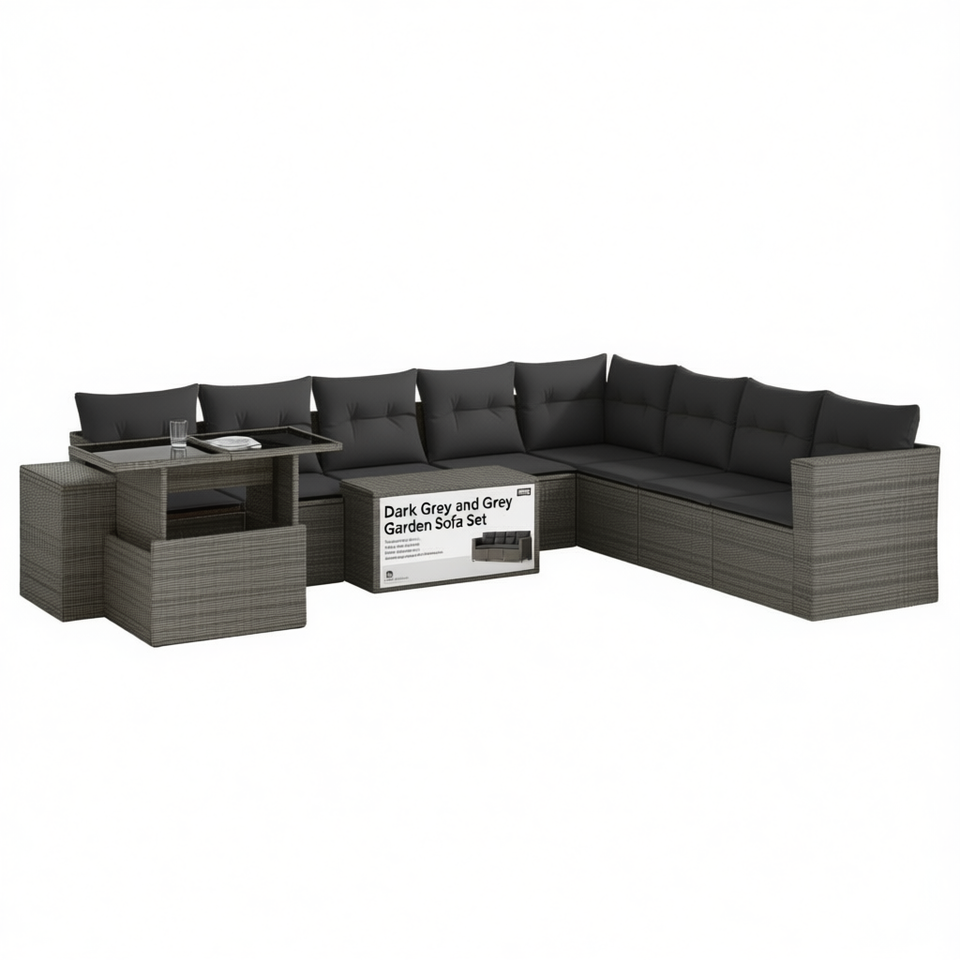 ชุดโซฟาสวนสีเทาเข้มและสีเทา วัสดุหวายสำหรับกลางแจ้ง รองรับที่นั่งได้มากกว่า 10 ที่นั่ง ทนทานต่อสภาพอากาศ ดีไซน์ร่วมสมัย