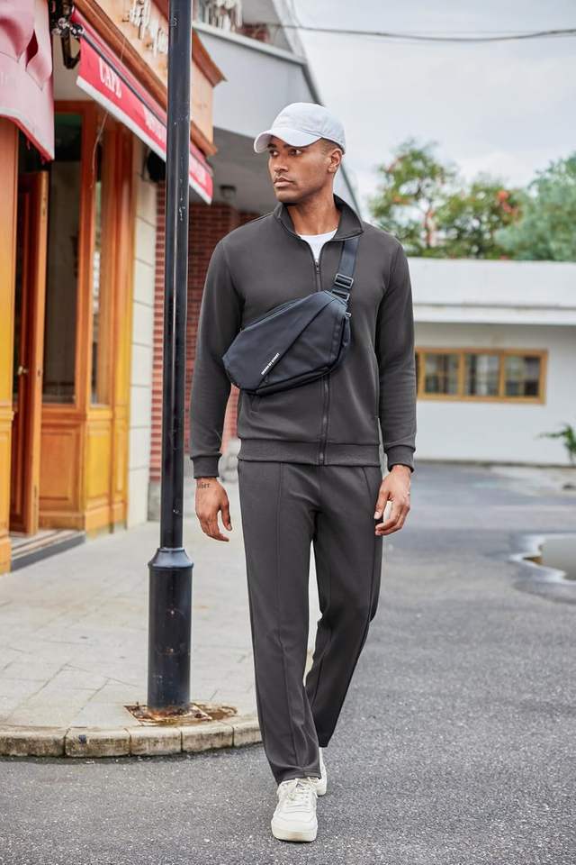 ชุดวอร์มลำลองผู้ชายสีเทาเข้ม 2 ชิ้น ชุดกีฬาแบบมีซิปเต็มตัว ชุดวิ่งออกกำลังกายลายแจ็คการ์ด แจ็คเก็ตและกางเกงแฟชั่น