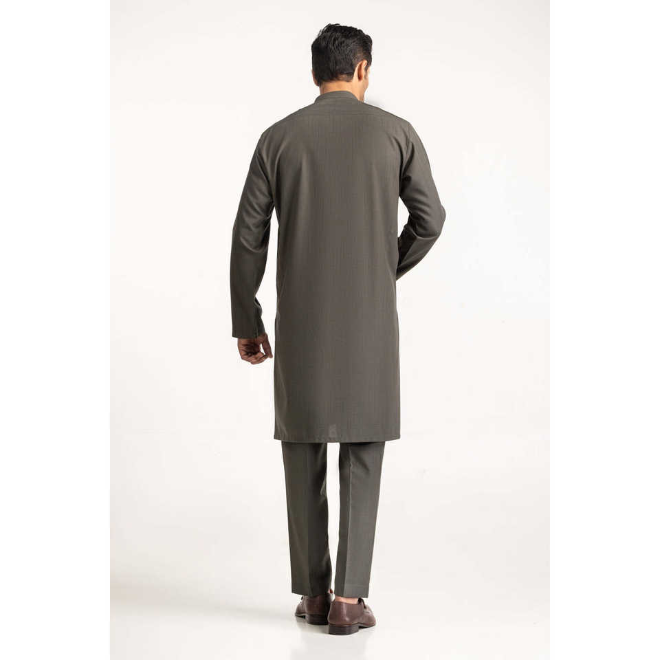 ชุดสูทผู้ชายทรงเข้ารูปสีเทาเข้ม 3 ชิ้น สไตล์ธุรกิจ กางเกงขายาว กระดุมแถวเดียว