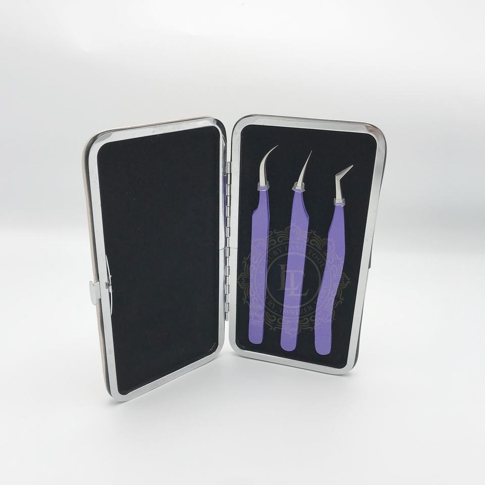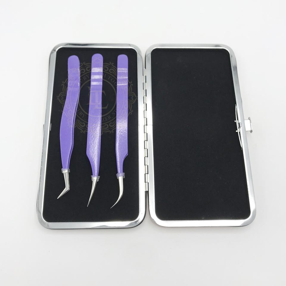 ขนตาปลอมสแตนเลสแบบแฮนด์เมดมาใหม่แหนบเคลือบผงสีม่วงเข้มพร้อมโลโก้ปลายแหลมสีเงินออกแบบได้ตามต้องการ