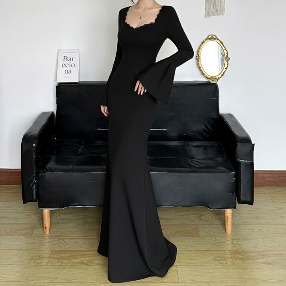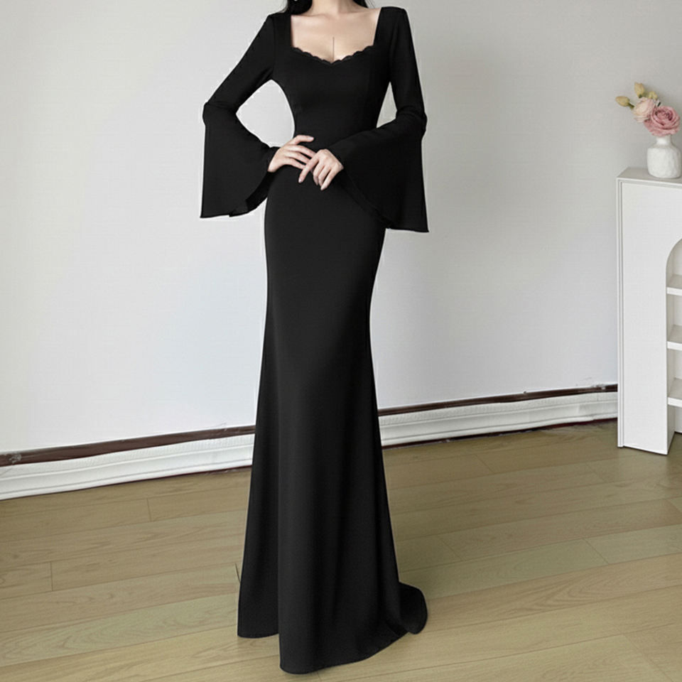 เดรสยาวทรงสี่เหลี่ยม คอวี แขนยาว แขนทรงระฆัง สีพื้น เรียบหรู เซ็กซี่ ช่วยพรางหุ่น