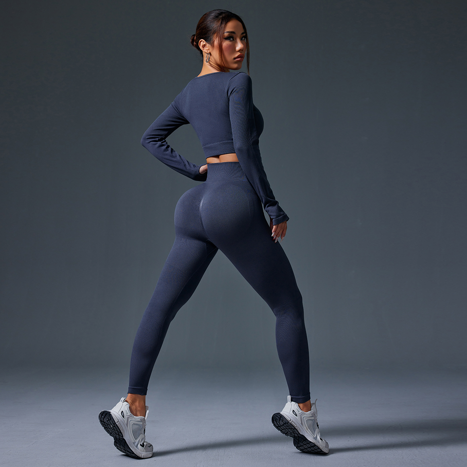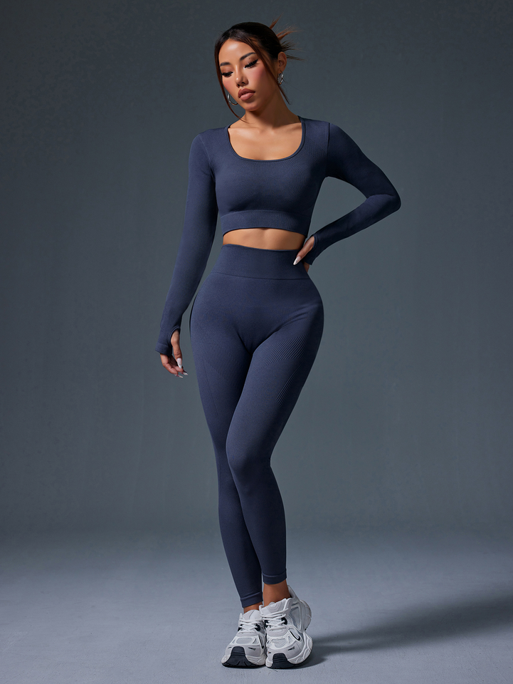 ชุดโยคะสำหรับผู้หญิงสองชิ้นถุงมือครึ่งนิ้วคอกลมทรงสี่เหลี่ยมสีน้ำเงินเข้มกางเกงขายาว