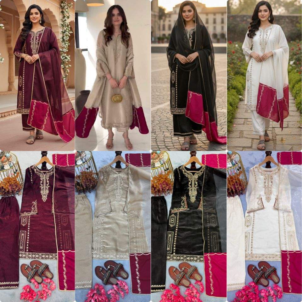 ชุดเดรสสีเข้มสไตล์ดั้งเดิมสำหรับงานปาร์ตี้ ผ้าไหมแห้งเร็ว แบรนด์ JimmyChoo สำหรับผู้หญิง ประกอบด้วยเสื้อ กางเกงขายาว และผ้าคลุมไหล่ เหมาะสำหรับงาน Diwali และงานแต่งงาน
