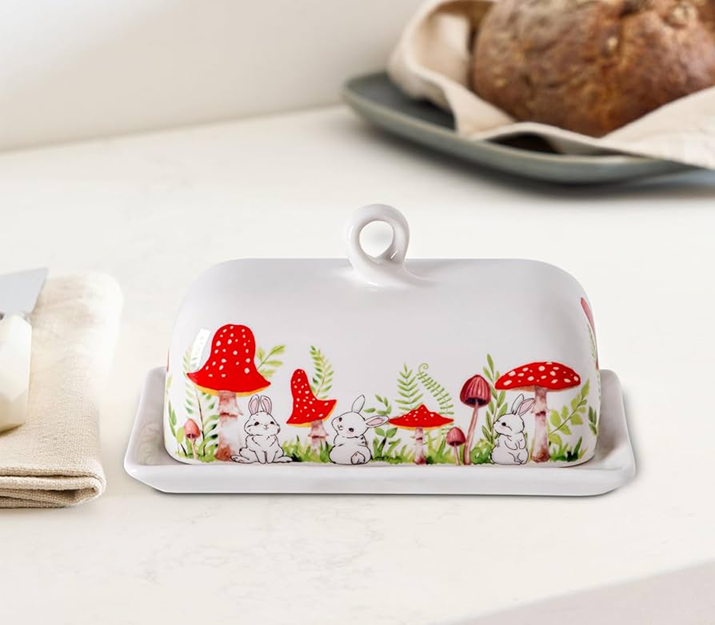 จานเนยเซรามิกสีเขียวเข้มพร้อมเห็ดมีพิษสีแดงนูนมีฐานสีแดงตัดกันมีจำหน่ายในราคาขายส่ง