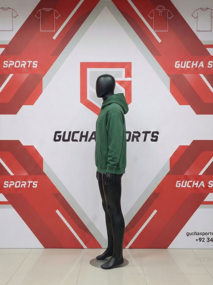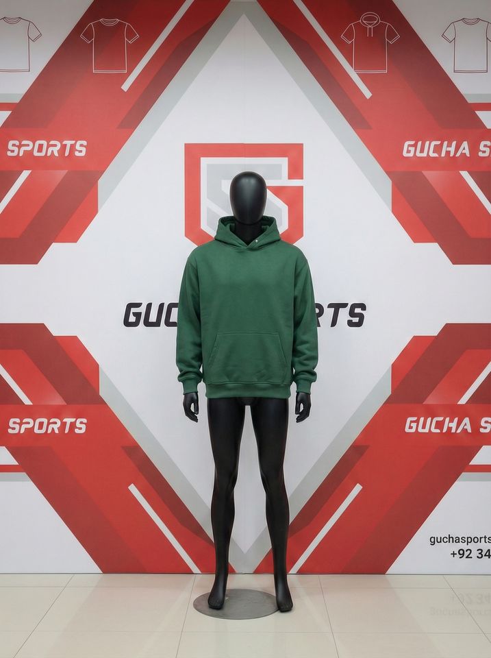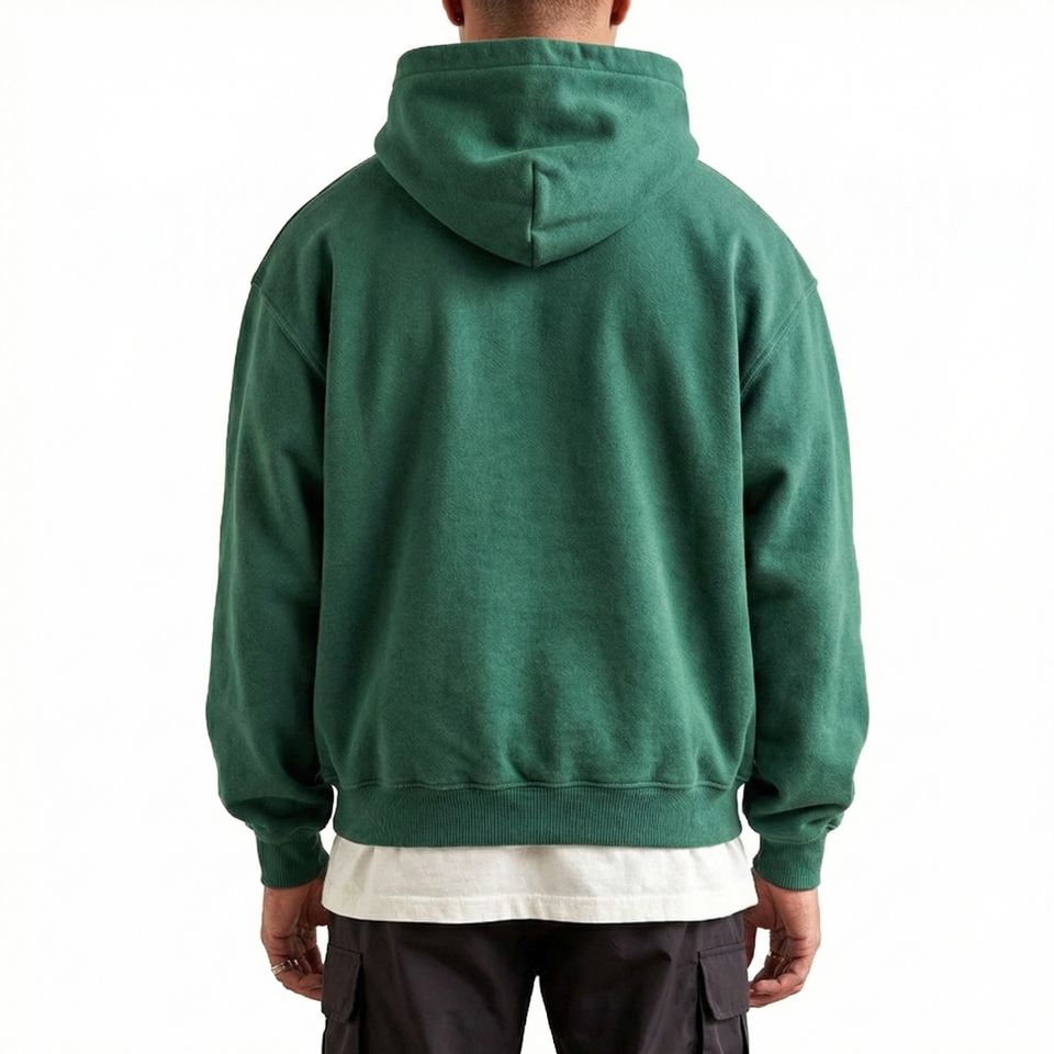 เสื้อฮู้ดดี้สีเขียวเข้ม ผลิตจากผ้าฝ้ายฟลีซเนื้อนุ่ม ทรงหลวมใส่ได้ทั้งชายและหญิง มีกระเป๋าแบบจิงโจ้ ฮู้ดปรับได้ ปลายแขนเสื้อแบบริบ
