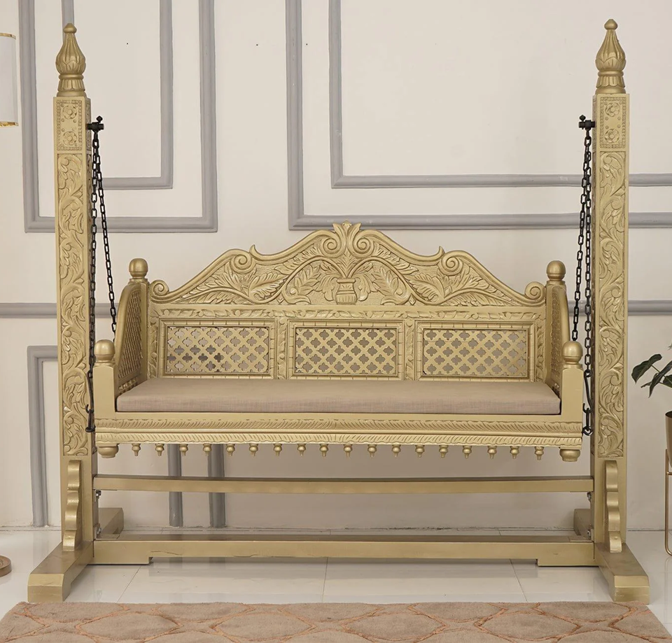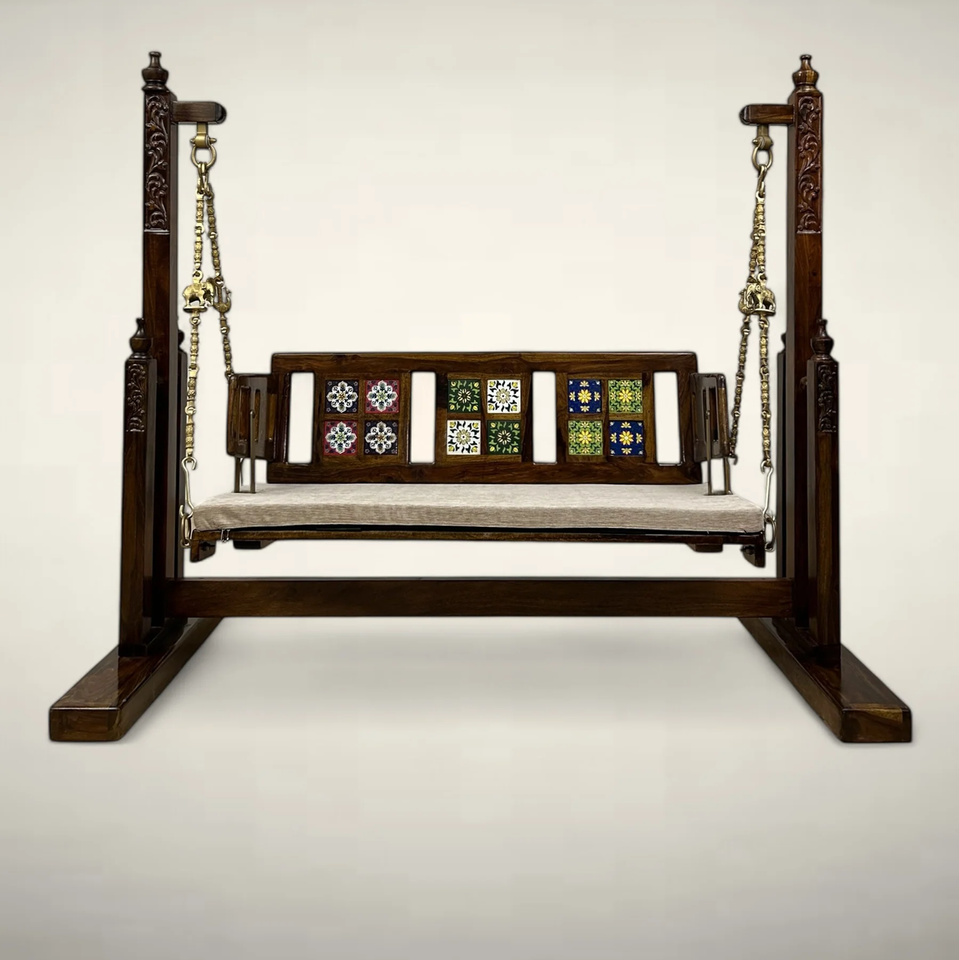 ชิงช้าไม้สีเข้มพร้อมกรอบและแผ่นหลังทาสีตกแต่งสีสันสดใสสำหรับใช้ในร่มราคาขายส่ง
