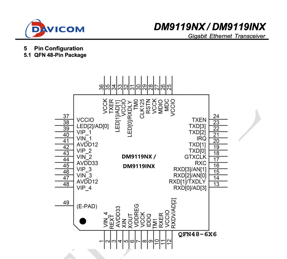 ลักษณะ:The DM9119NX / DM9119INX is a single-chip Gigabit Ethernet Transceiver, which is compliant with IEEE 802.3 Media Access Controller,, and IEEE 802.3u 1000BASE-T/100BASE-TX/10BASE-T. It also supports IEEE 802.3az, Energy Efficient Ethernet (EEE). The advanced on-chip mixed signal processing such as equalization, crosstalk cancellation,, clock recovery, error correction, crossover detection/correction, polarity correction, provide robust transmission and reception over the standard Unshielded Twisted Pair (UTP) CAT6/CAT5e/CAT5/ CAT3(10Mbps only) cable., The DM9119NX / DM9119INX supports the Gigabit Media Independent Interface (GMII) and Reduced Gigabit Media Independent Interface (RGMII) to the MAC controller.