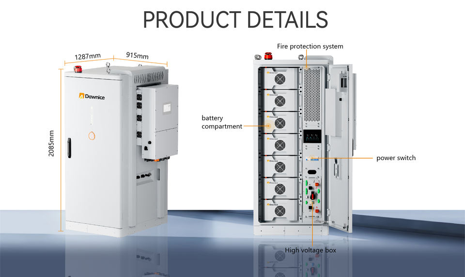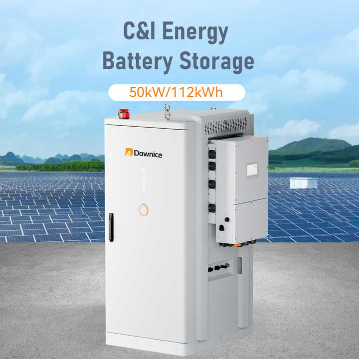 สถานีไฟฟ้าสำรองเชิงพาณิชย์ออลอินวัน Dawnice 50KW 100KWh 112kWh ระบบไฮบริดแบบเชื่อมต่อ/ไม่เชื่อมต่อกับระบบไฟฟ้าสาธารณะ แบตเตอรี่ LiFePO4 ระดับ IP54 ระบบระบายความร้อนด้วยอากาศ