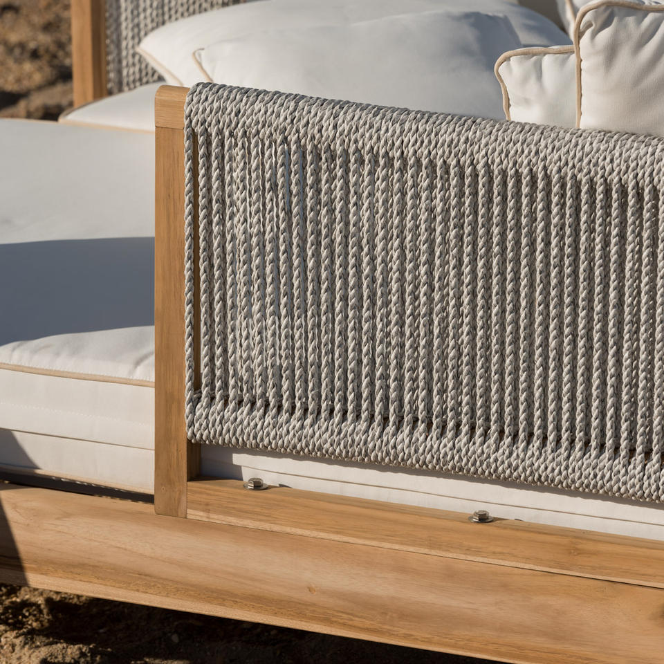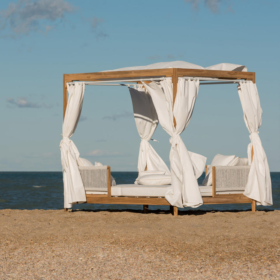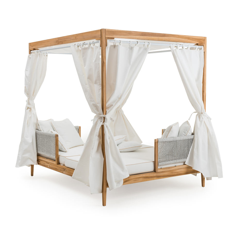 เตียงนอนกลางแจ้งแบบมีหลังคา รุ่นซานเต้ คุณภาพสูง ยี่ห้อซาเยน ทำจากไม้สักแท้ พร้อมเชือกถักสีขาว และหลังคา