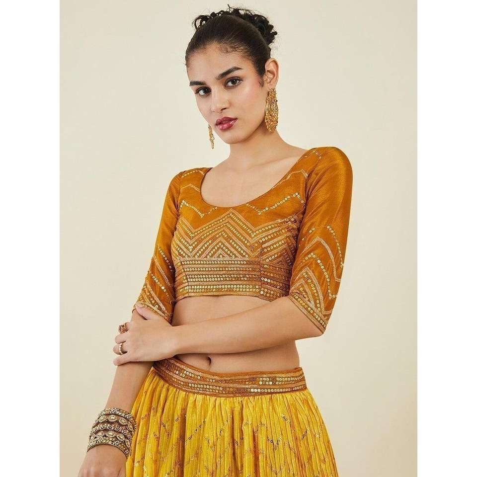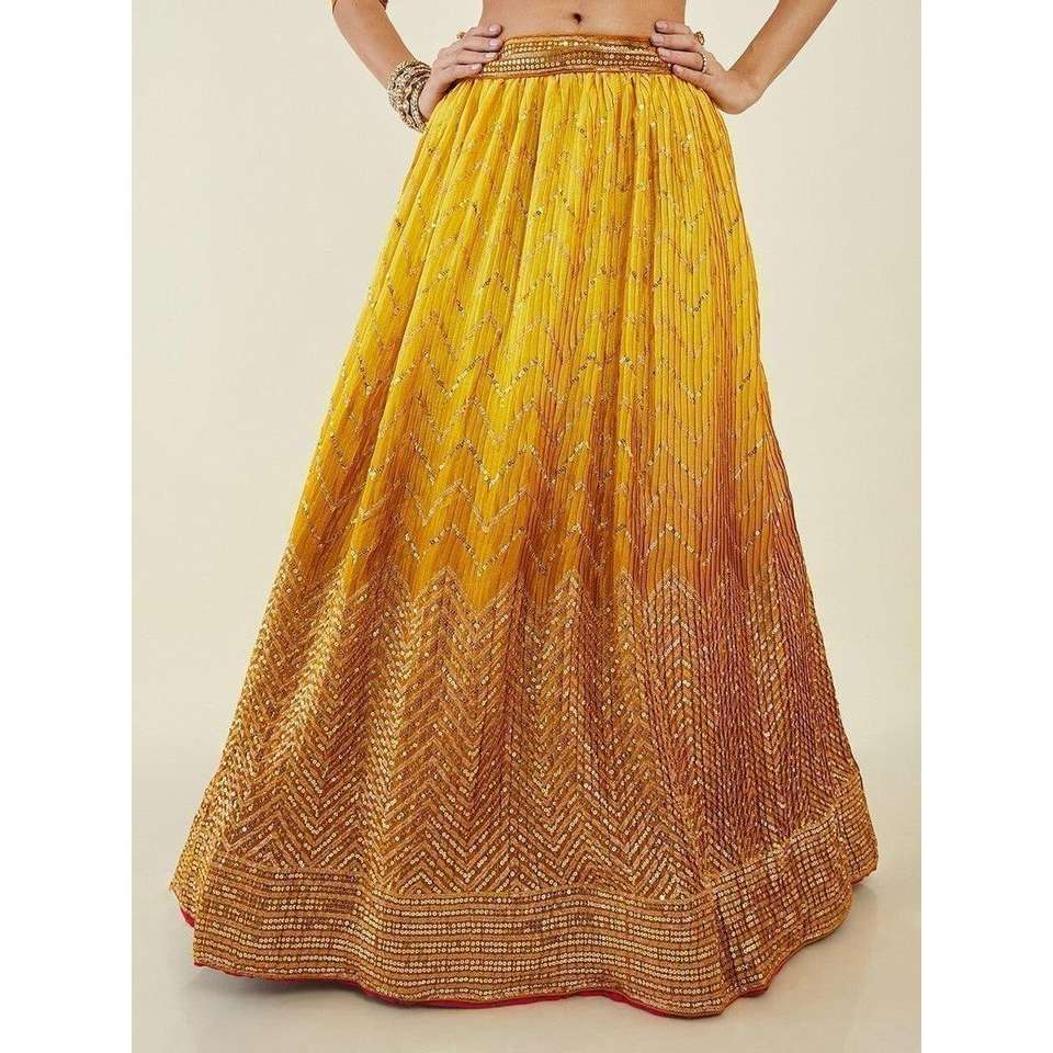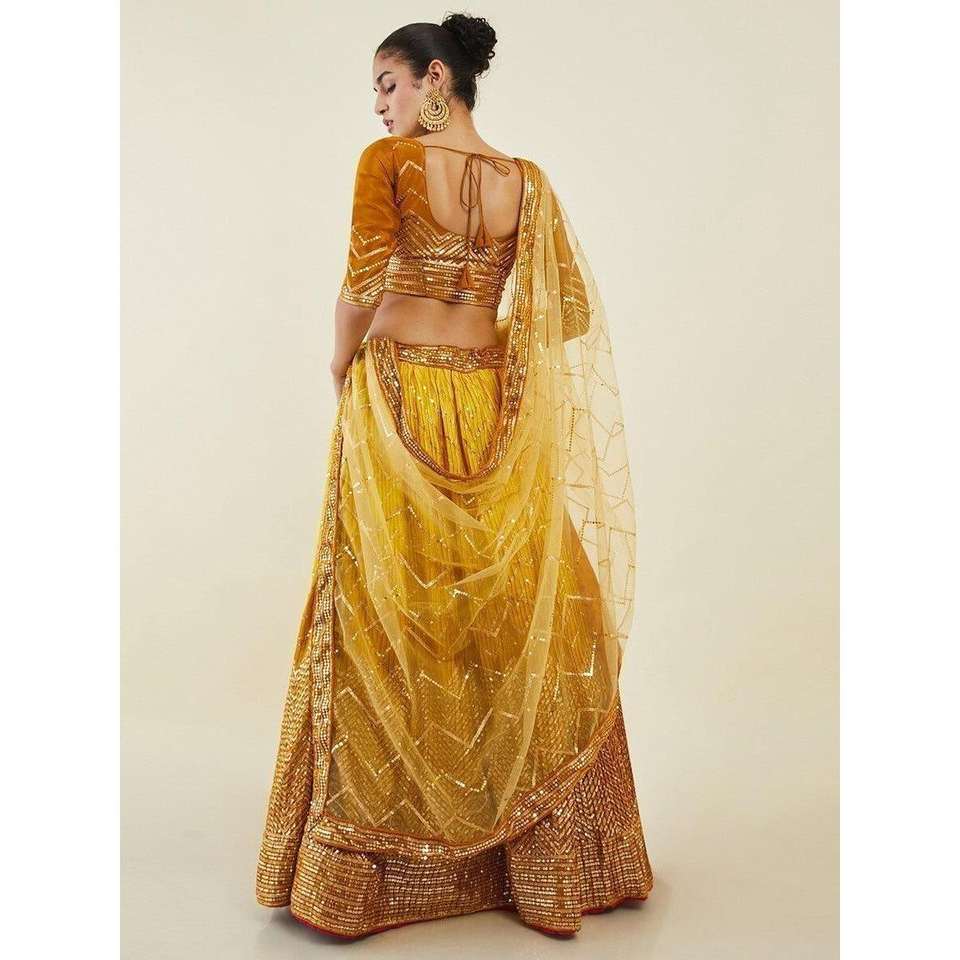 ผ้าไหมฮาลดีปักเลื่อมสีเหลืองพราวชุด lehenga choli กับ dupatta