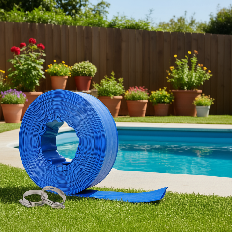 สายยางระบายน้ำแบบแบน ขนาด 1-1/2 นิ้ว ยาว 2.6 นิ้ว สีน้ำเงิน ทำจาก PVC คุณภาพสูง สำหรับงานหนัก ความยาว 100 ฟุต ใช้สำหรับล้างสระว่ายน้ำและสวน