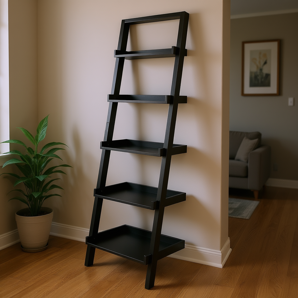 ชั้นวางของแบบเอนได้ 5 ชั้น สีดำ ยี่ห้อดีบี เบลลามี สำหรับจัดเก็บและโชว์สินค้า ดีไซน์มินิมอล เหมาะสำหรับห้องนั่งเล่น