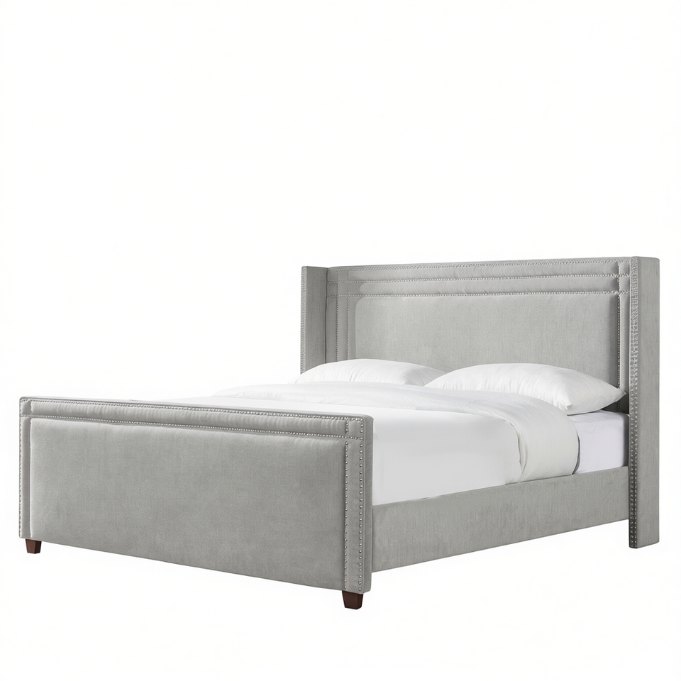เตียงคิงไซส์รุ่นดีบี เอลล์ วิงแบ็ค สีเงินเทา หุ้มด้วยผ้าโพลีเอสเตอร์เนื้อนุ่ม พร้อมดีไซน์แบบติดกระดุม สำหรับเฟอร์นิเจอร์ห้องนอนสไตล์ทรานซิชั่น