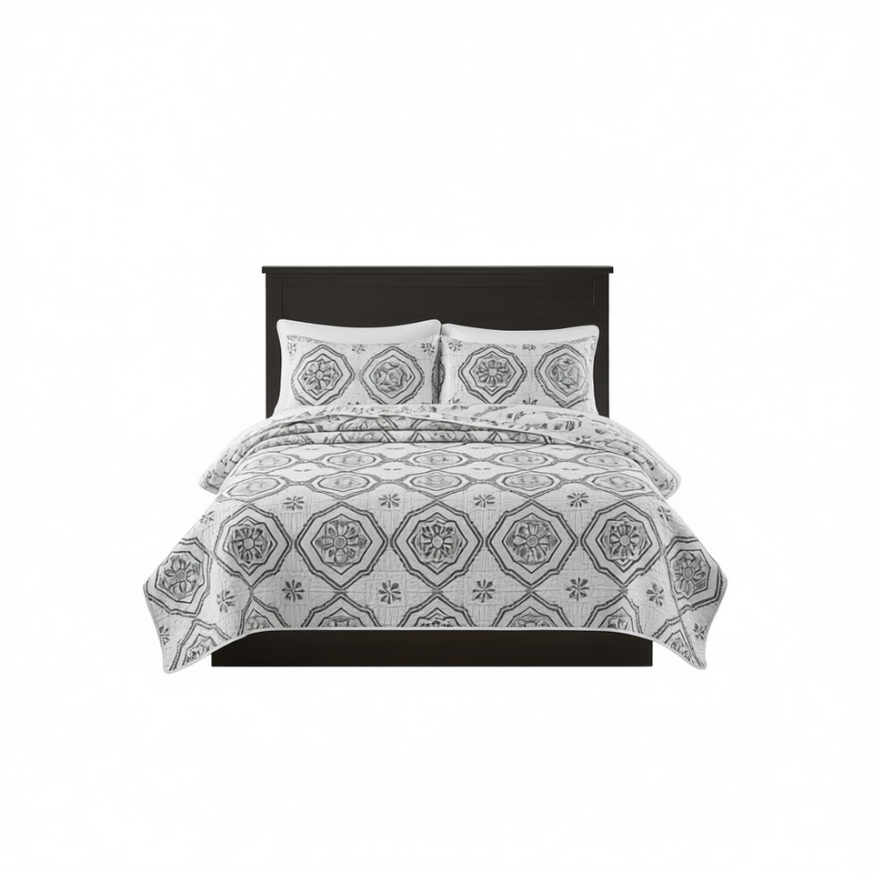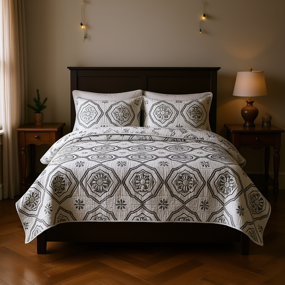 ชุดผ้านวมแบบกลับด้านได้ ขนาดคิงไซส์/แคลคิงไซส์ ลายดอกไม้เรขาคณิตสไตล์วินเทจ 3 ชิ้น บรรจุใยฝ้าย