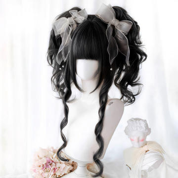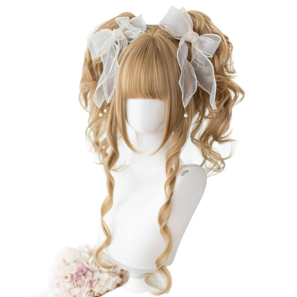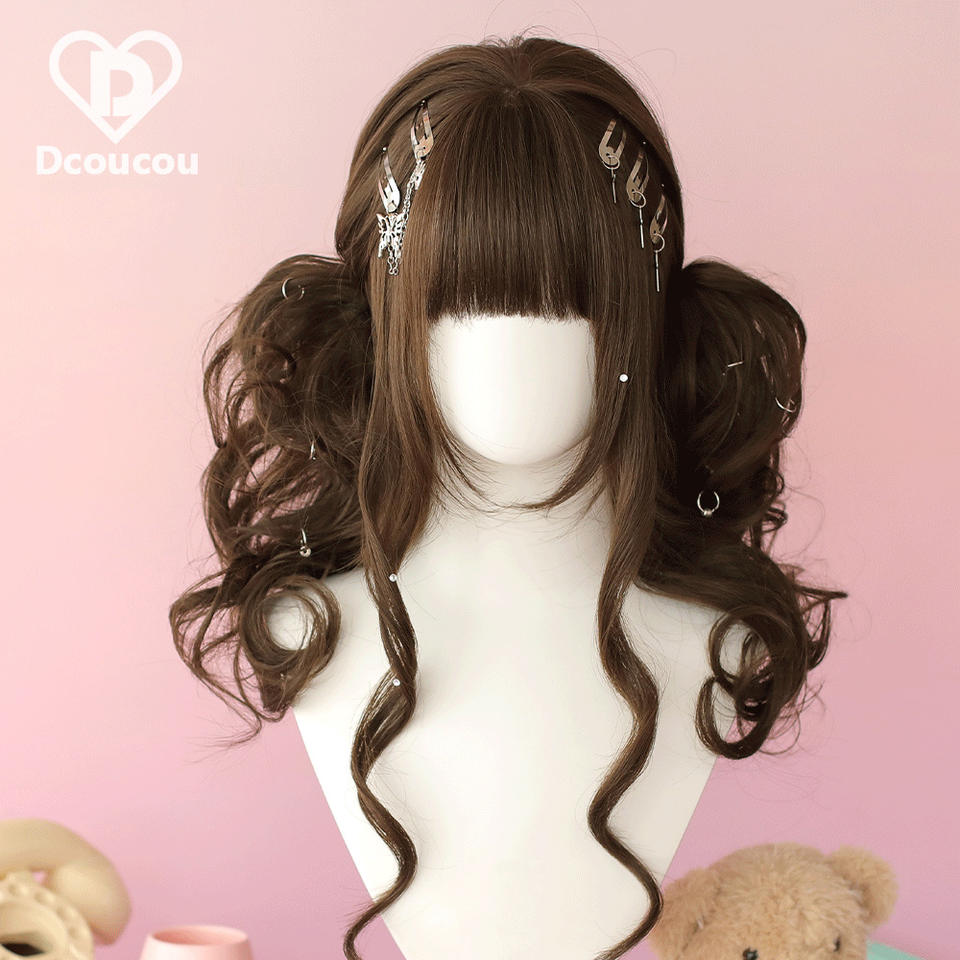 วิกผมหางม้าคู่สไตล์โลลิต้าสำหรับผู้หญิง Dcoucou ผมยาวหยิกพร้อมหน้าม้า โบว์สีขาว ไม่ต้องใช้กาว ครอบคลุมทั้งศีรษะ