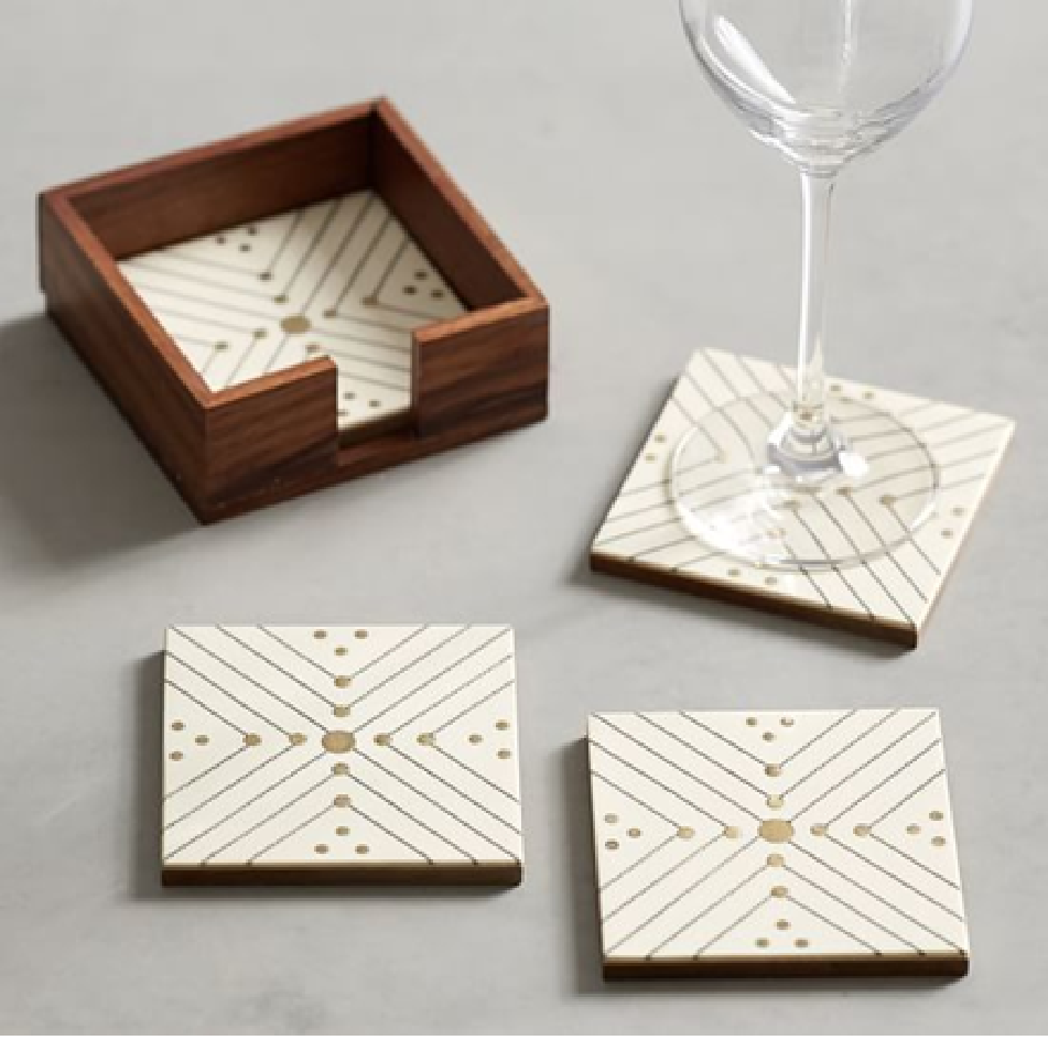 แผ่นรองแก้วหินอ่อนทรงสี่เหลี่ยมสไตล์เดโค พร้อมลายฝังทองเหลืองและฐานไม้ มีจำหน่ายในราคาขายส่ง