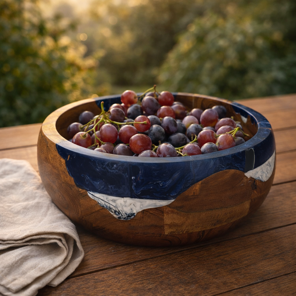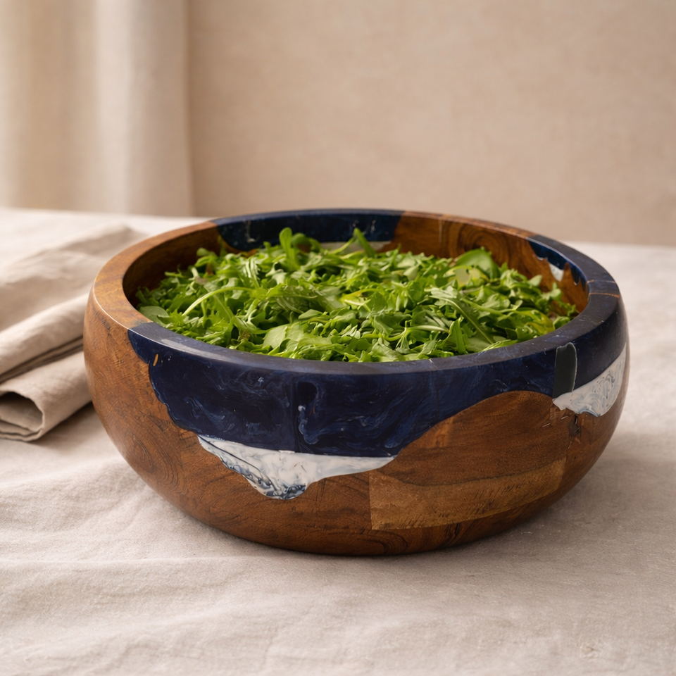 ชามสลัดไม้กระถินณรงค์ตกแต่งด้วยเรซิ่นอีพ็อกซี่สีน้ำเงินขาวทรงกลมสีน้ำตาลธรรมชาติ งานแฮนด์เมด สำหรับเสิร์ฟอาหาร งานปาร์ตี้ และตกแต่งบ้าน
