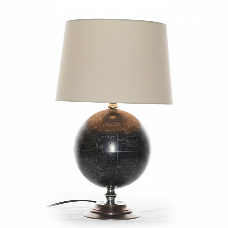 โคมไฟตั้งโต๊ะทรงโลกโบราณตกแต่งอย่างสวยงาม พร้อมลวดลายแผนที่โลกที่ละเอียดอ่อน และโคมไฟผ้าเนื้อนุ่ม เหมาะสำหรับสำนักงาน
