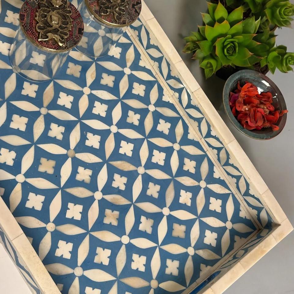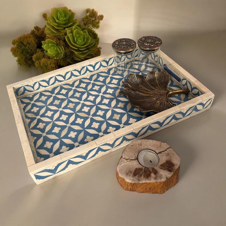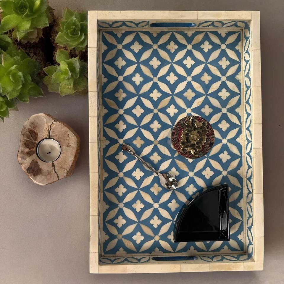 ถาดเสิร์ฟทำจากไม้ฝังกระดูกสำหรับตกแต่งทำด้วยมือสีน้ำเงินและสีขาวทรงสี่เหลี่ยมทันสมัยสำหรับงานแต่งงานและเทศกาลดิวาลี
