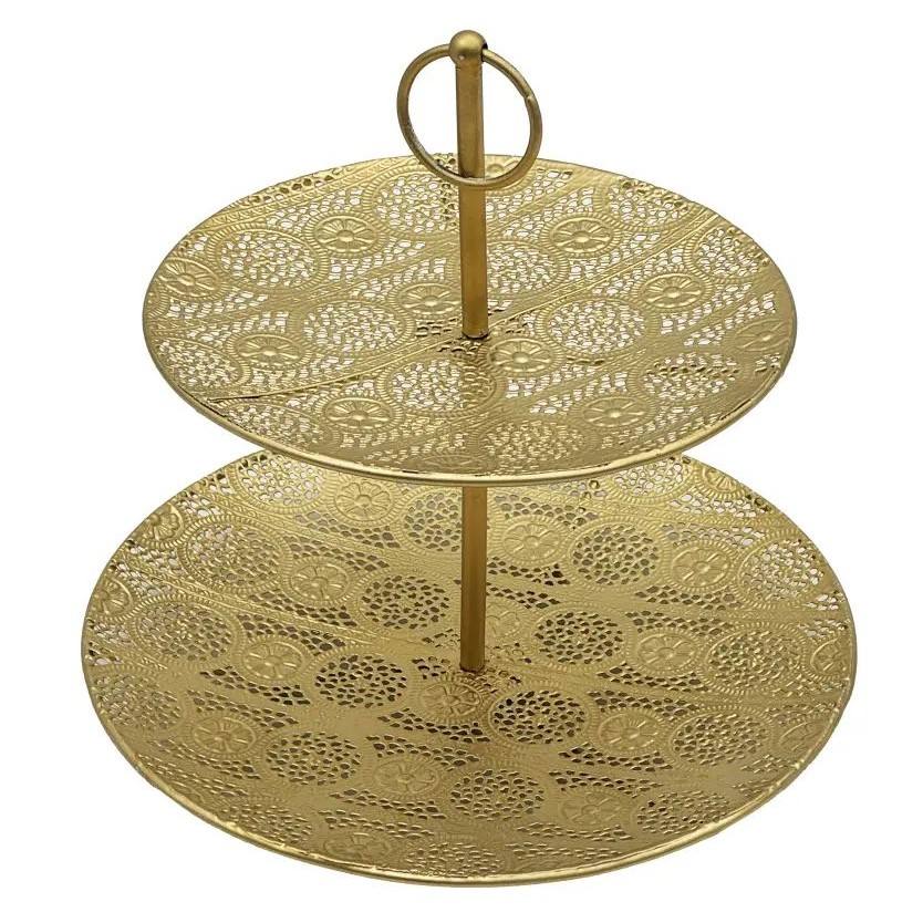 ถาดขนมสองชั้นทองเหลืองตกแต่งพร้อมหูจับแบบวงแหวน สำหรับงานเลี้ยงน้ำชา จัดแสดงเบเกอรี่ ตกแต่งบ้าน ตกแต่งโต๊ะ ใช้ในครัว