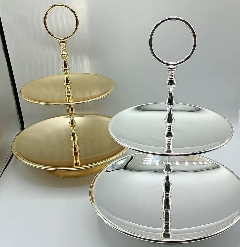 ถาดขนมสองชั้นทองเหลืองตกแต่งพร้อมหูจับแบบวงแหวน สำหรับงานเลี้ยงน้ำชา จัดแสดงเบเกอรี่ ตกแต่งบ้าน ตกแต่งโต๊ะ ใช้ในครัว