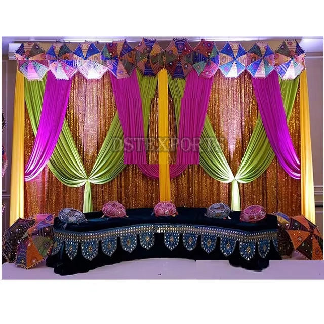 ตกแต่งเตียงเจ้าสาวสำหรับ Sangeet mehndi. คืนซูเปอร์ Sangeet mehndi. ที่นั่งกลางคืนตกแต่งสีสันสดใสออกแบบที่นั่ง medhid USA