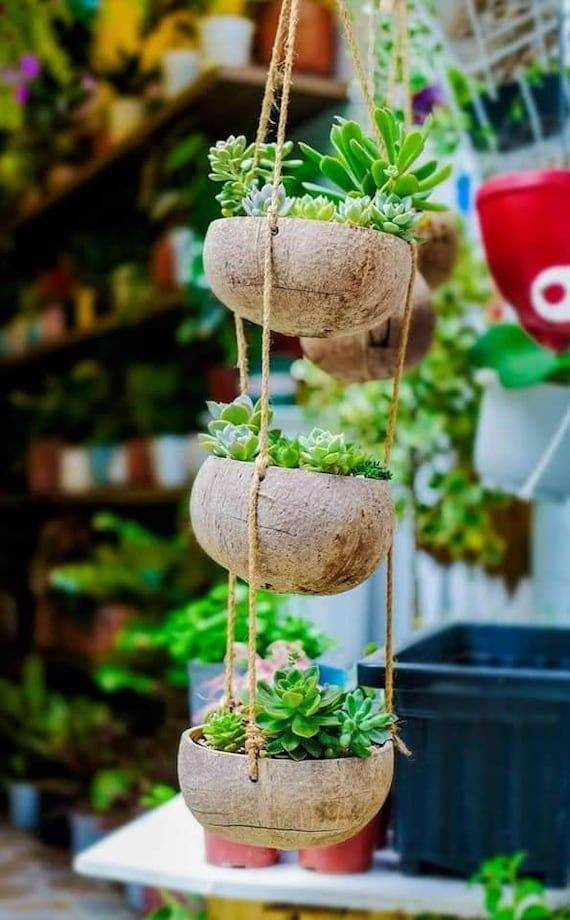 กระถางเปลือกมะพร้าวตกแต่งสำหรับปลูกต้นไม้และดอกไม้ที่สมบูรณ์แบบสำหรับสวนอย่างยั่งยืนและความสวยงามในบ้านบัวสีน้ำเงิน