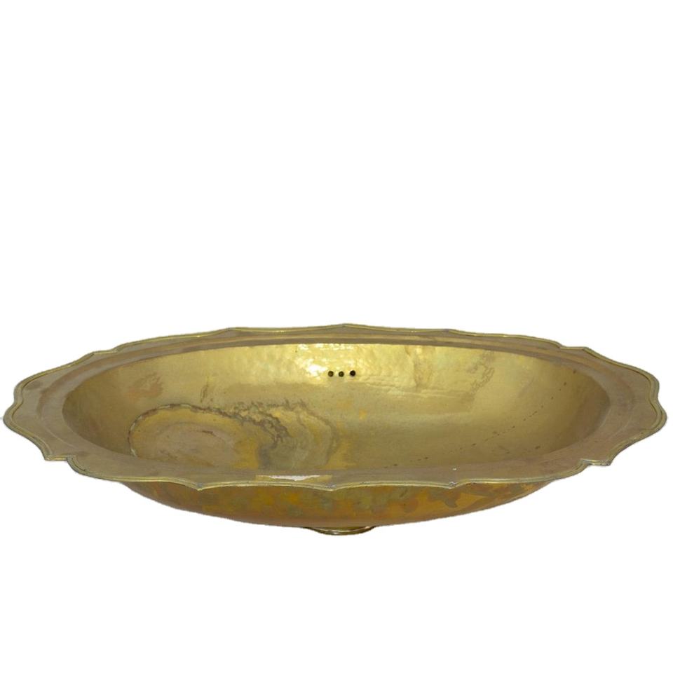 อ่างล้างหน้าทองเหลืองรูปวงรี ดีไซน์หรูหรา พร้อมขอบหยัก สำหรับวางบนเคาน์เตอร์ห้องน้ำ ตกแต่งอย่างมีศิลปะ