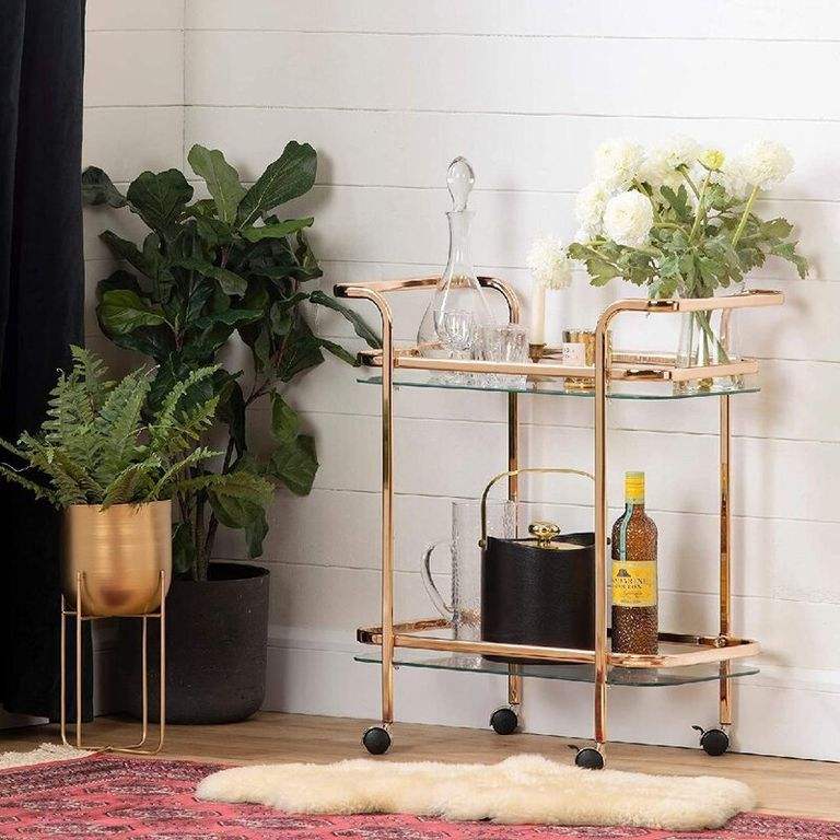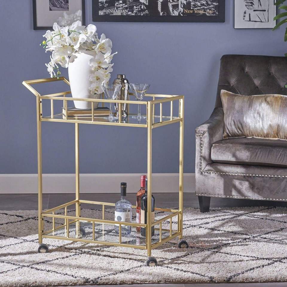 Decorative Iron Bar Cart with Gold Finish Frame and Glass Shelves Rolling Serving Trolley for Home Kitchen Dining Furniture Use