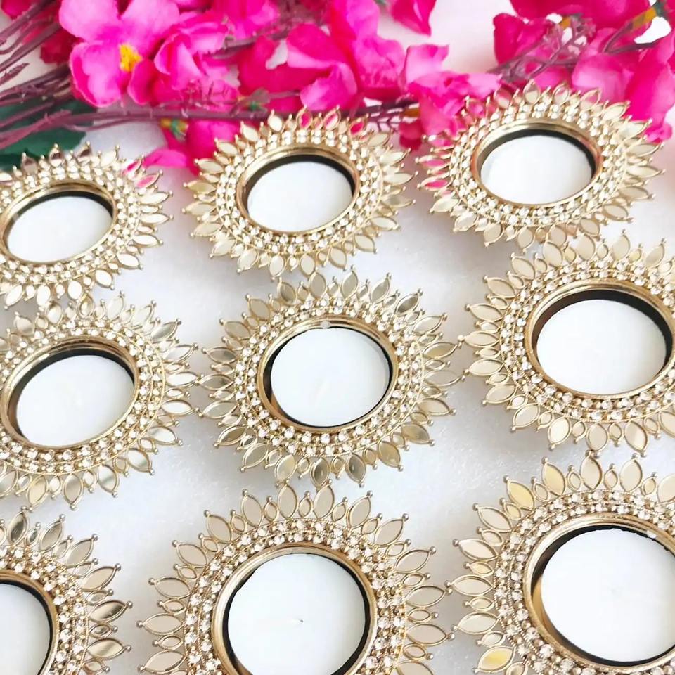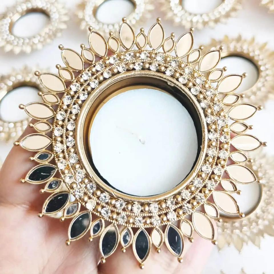 ที่วางเทียนตกแต่งบ้านแบบดั้งเดิมอินเดียพร้อม kundan แก้วทรงกลมและโต๊ะโลหะตกแต่งบันไดสำหรับขวดโหลเทียน