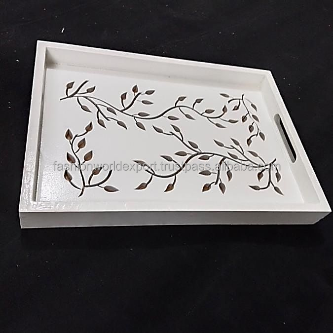 ถาดเสิร์ฟไม้ MDF ลายดอกไม้สีขาวหรูหราทำมือในอินเดียถาดเสิร์ฟมาตรฐานสำหรับตกแต่งอย่างยั่งยืนเป็นมิตรต่อสิ่งแวดล้อม