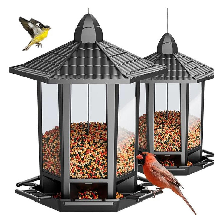 ที่ให้อาหารนกโลหะตกแต่งพร้อมหลังคาป้องกันฝนและดีไซน์กรงป้องกันกระรอกสำหรับสถานีให้อาหารในสวนหลังบ้าน