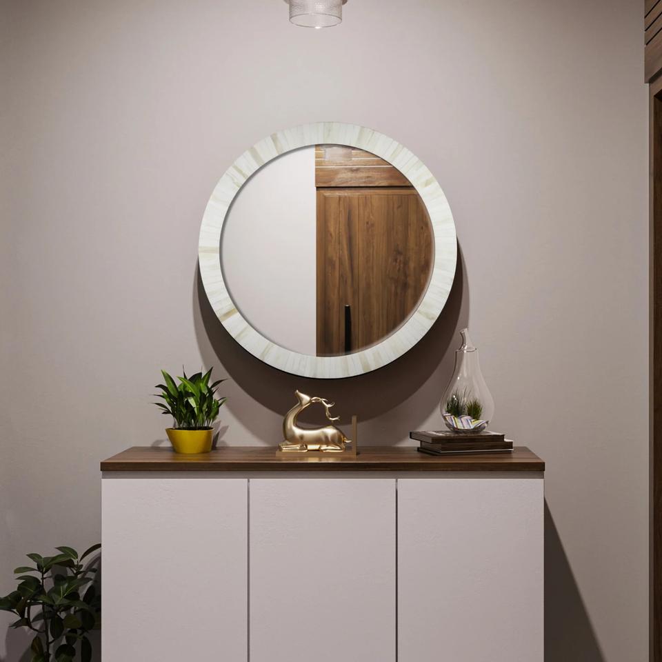 กระจกติดผนังทรงกลมตกแต่งสไตล์โมเดิร์นพร้อมกรอบฝังลาย เป็นมิตรกับสิ่งแวดล้อม เหมาะสำหรับงานบาร์มิตซ์วาห์ กระจกแบบร่วมสมัยที่สามารถปรับแต่งได้