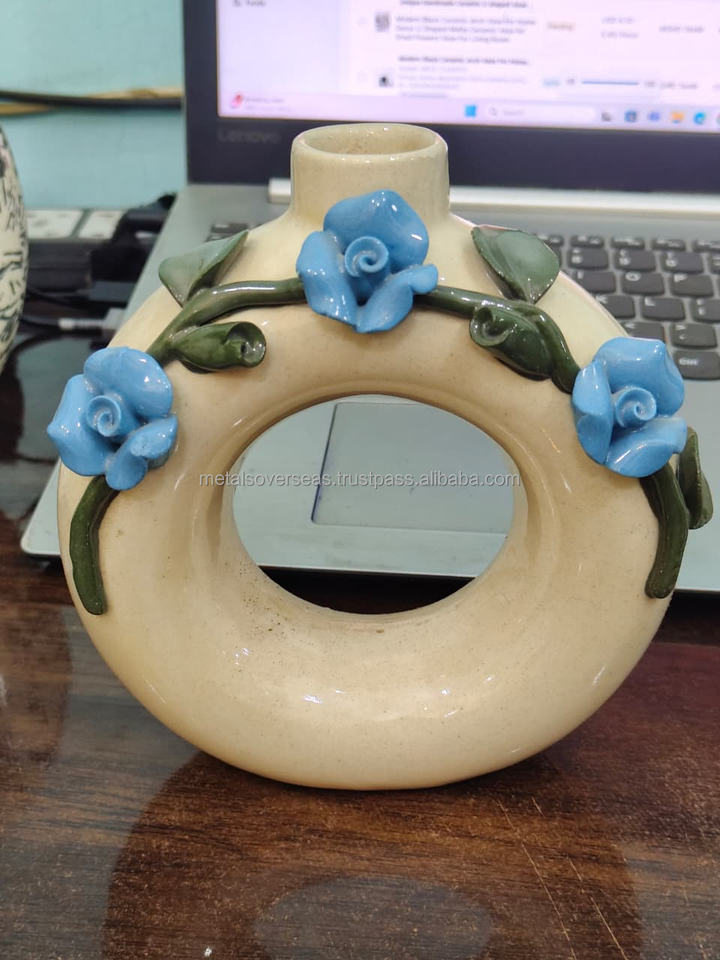แจกันดอกไม้เซรามิกทรงกลมประดับด้วยดอกกุหลาบสีน้ำเงินแจกันเซรามิกทำด้วยมือพร้อม3D ประดับดอกไม้