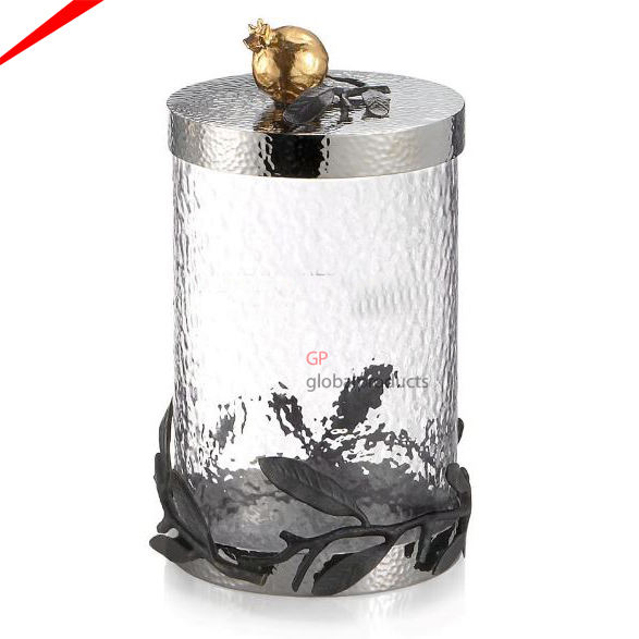 กระป๋องแก้วกลมตกแต่งด้วยฝาโลหะสีทองและฝาหินอ่อนถังโลหะฐานสำหรับคุกกี้