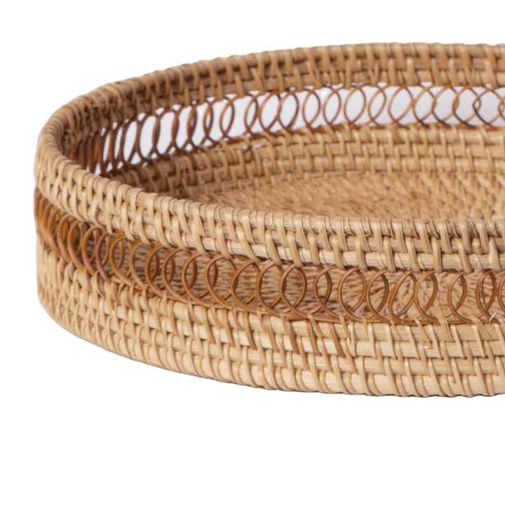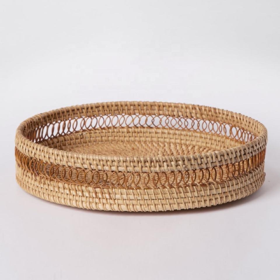 ถาดเสิร์ฟทรงกลมหวายตกแต่ง พร้อมขอบลายสานประณีต ถาดจัดระเบียบบนโต๊ะทำจากหวายรักษ์โลก และถาดครัวที่ยั่งยืน