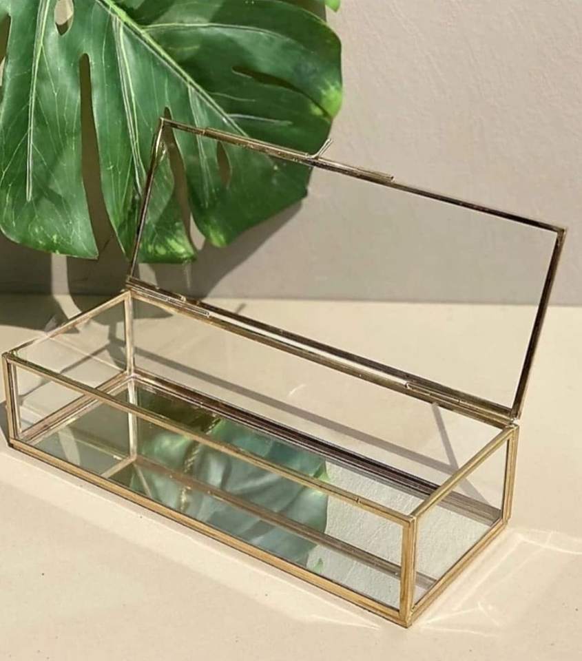 กล่องเลื่อนตกแต่งทำจากแก้วคุณภาพพรีเมี่ยมและทองเหลืองสำหรับจดหมายหรือกล่องเชิญงานแต่งงานหรืออุปกรณ์จัดระเบียบเครื่องประดับจำนวนมาก