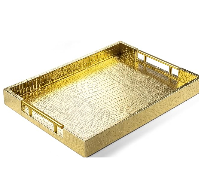 ถาดเสิร์ฟสำหรับตกแต่งพร้อมที่จับโลหะถาดหนังจระเข้ทำจากหนัง PU ถาดตกแต่งบ้านสำหรับใช้ในโรงแรมบ้าน