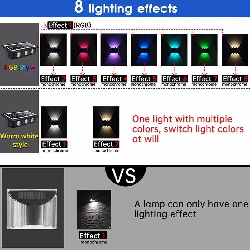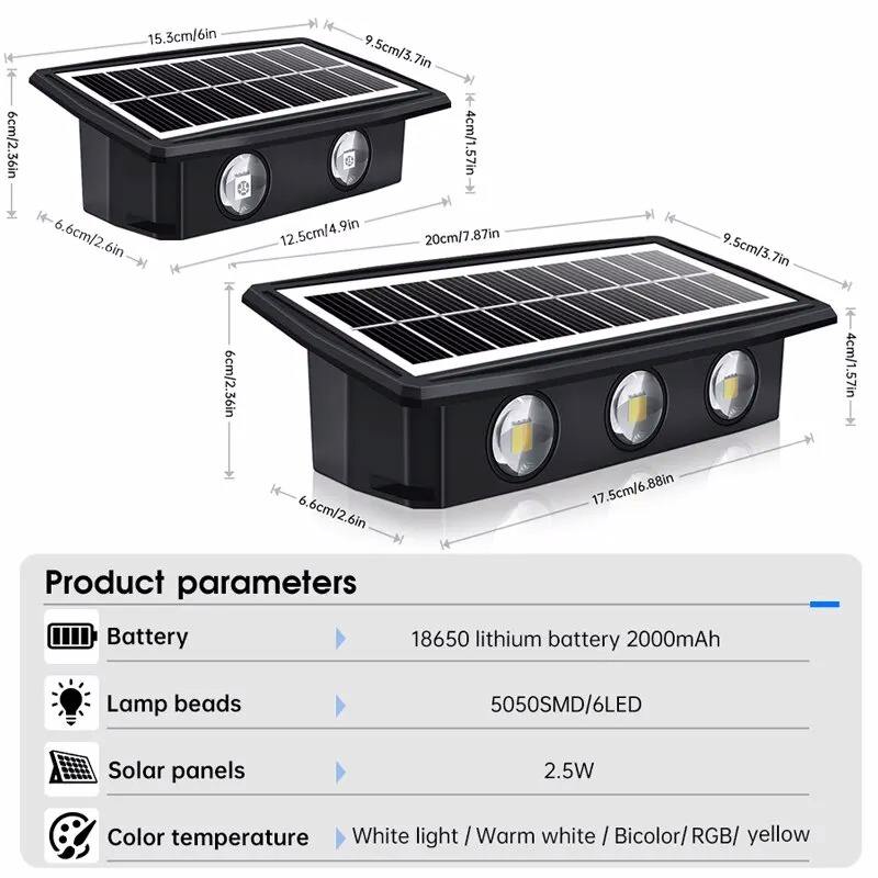 ไฟติดผนังพลังงานแสงอาทิตย์สำหรับตกแต่ง ไฟสวน ไฟบันได กันน้ำ IP65 ไฟ RGB สีขาว สีขาวอบอุ่น ไฟหลากสี ไฟโซลาร์กลางแจ้ง