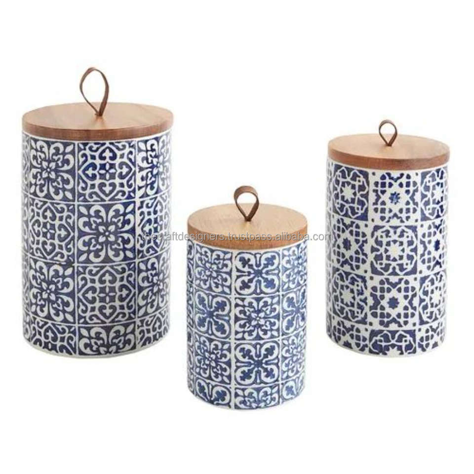 ตกแต่งหม้อโลหะอเนกประสงค์สำหรับห้องครัวโถกระป๋องพร้อมฝาไม้ลายม้าลายผลิตในอินเดีย