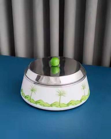 ภาชนะอุ่นอาหารสีขาวลายต้นปาล์ม ฝาโดมโลหะ ปุ่มสีเขียว ดีไซน์หรูหรา สำหรับใส่อาหาร