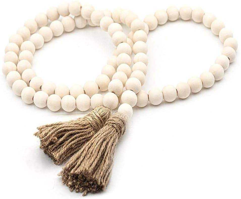 พวงลูกปัดไม้ตกแต่งพร้อมพู่ป่านสไตล์บ้านไร่ โบโฮ สำหรับตกแต่งผนังและโต๊ะ ลูกปัดไม้ธรรมชาติสำหรับตกแต่งบ้าน