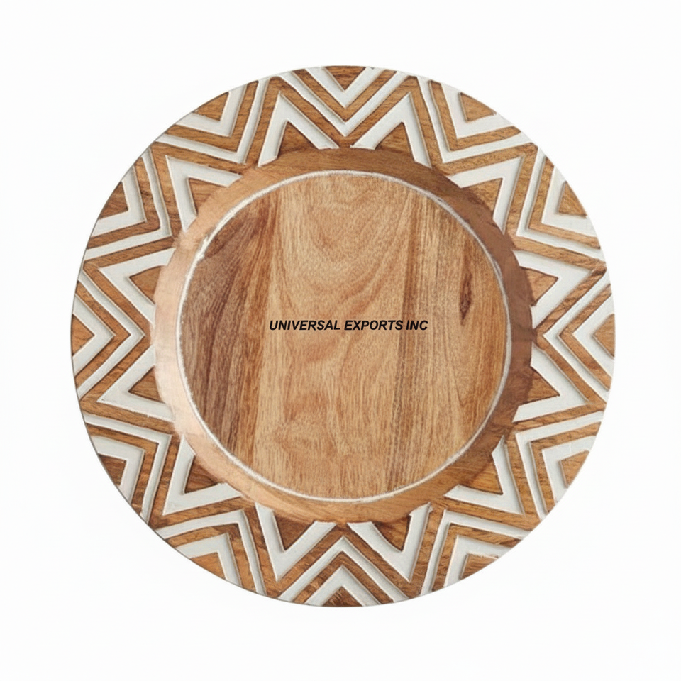 แผ่นชาร์จไม้ตกแต่งด้วยการออกแบบที่น่าสนใจทำด้วยมือใต้จานกำหนดขนาดเองได้แผ่นชาร์จไม้แฟนซี