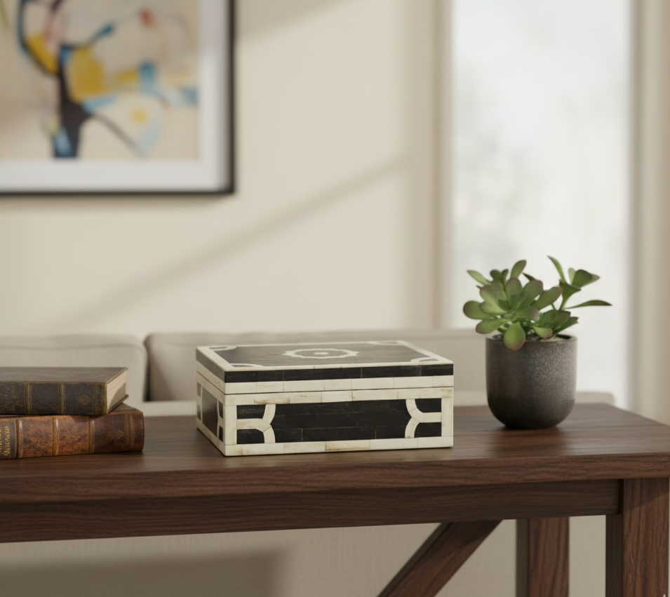 กล่องเก็บของตกแต่งฝังลายกระดูกและเขาสัตว์ทำมือ - ลายเรขาคณิตดอกไม้สีดำและสีขาว กล่องเก็บเครื่องประดับสุดหรู