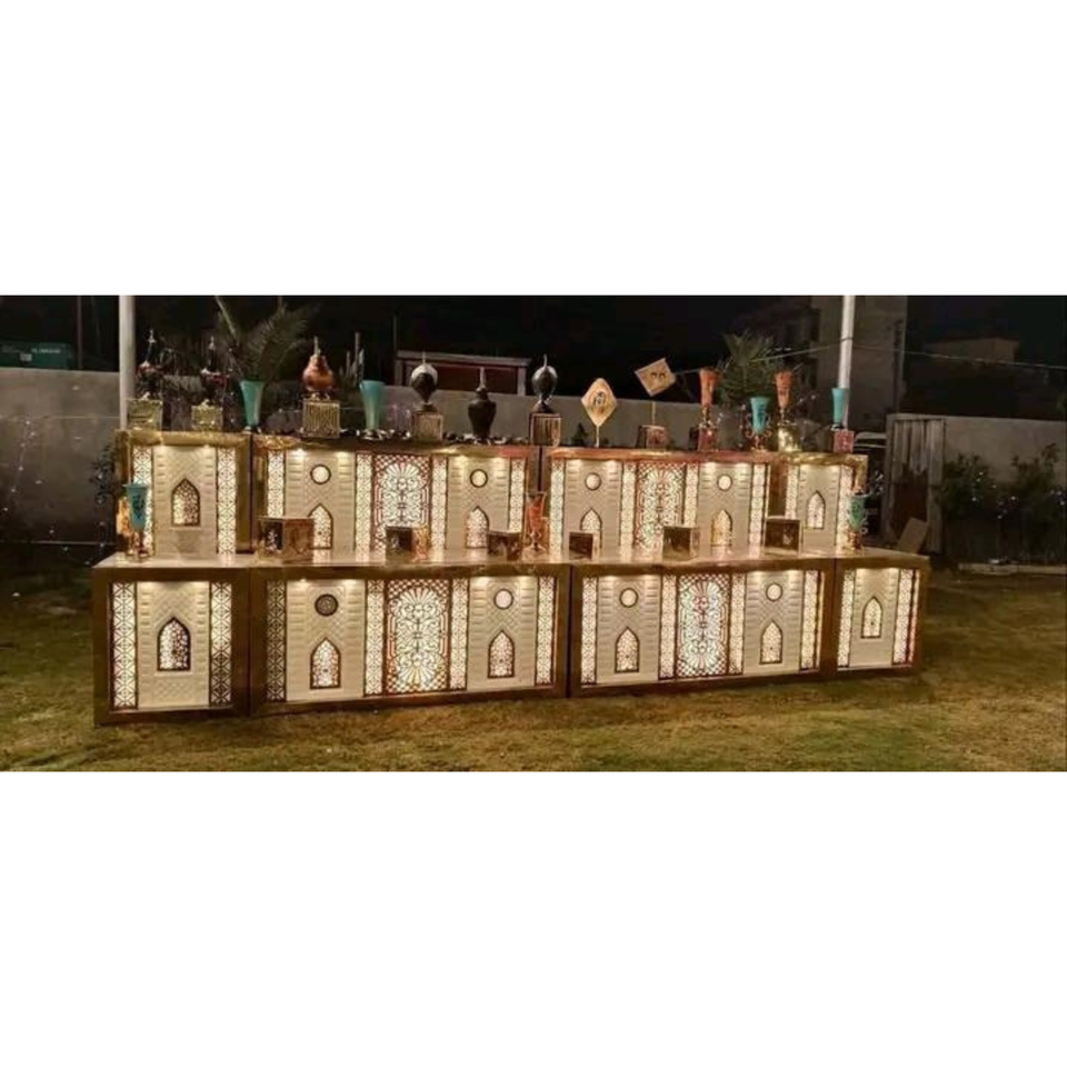 เคาน์เตอร์บุฟเฟ่ต์สแตนเลสตกแต่งสำหรับงานจัดเลี้ยง พร้อมผิวสัมผัสสีทองขัดเงา