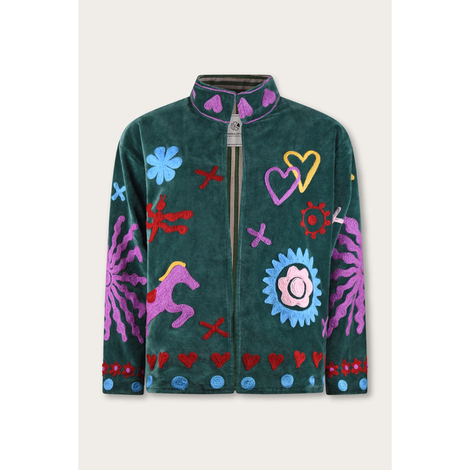 เสื้อแจ็คเก็ตกำมะหยี่ปักลายสีเขียวเข้มแบบสองด้าน ตกแต่งด้วยลายปักหลากสีสัน ความยาวสั้น เหมาะสำหรับฤดูใบไม้ร่วงและฤดูหนาว