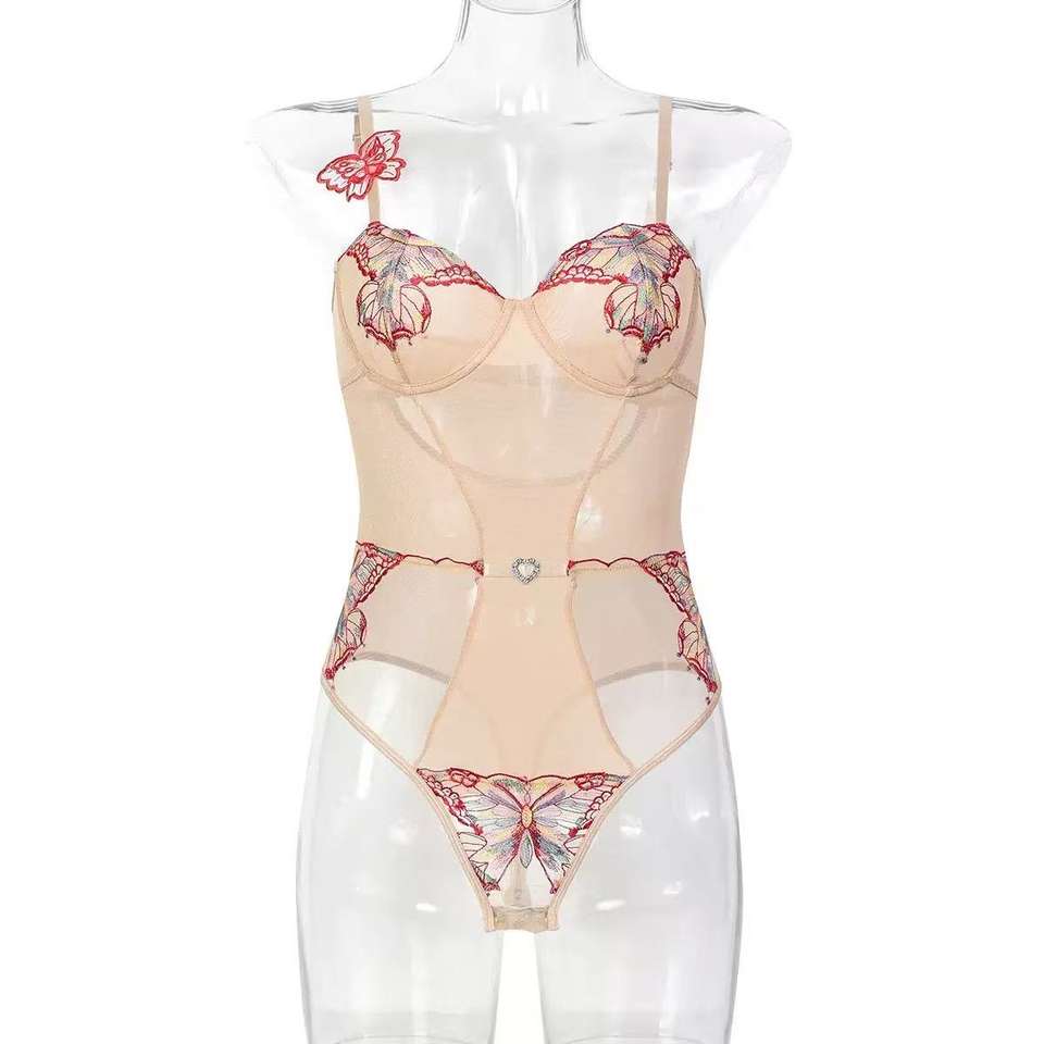 บอดี้สูทปักลายผีเสื้อสามมิติสีแดงสุดพิเศษ รุ่น Deep Love สีแอพริคอตเบจ กระดุมปิดเป้าแน่น ผลิตจากวัสดุรักษ์โลก