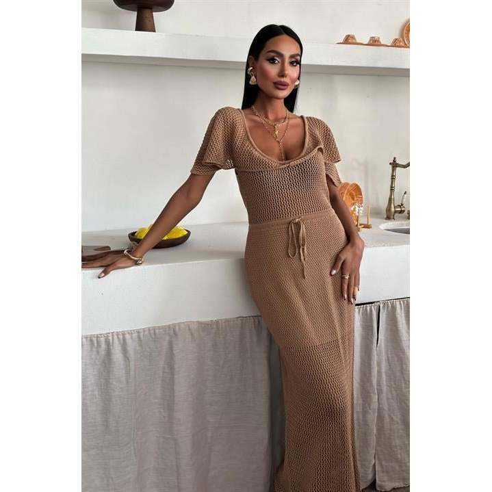 เดรสไหมพรมคอวีลึกพร้อมดีเทลตาข่ายระบายอากาศ 2867-เน้นส่วนเอวแบบธรรมชาติ