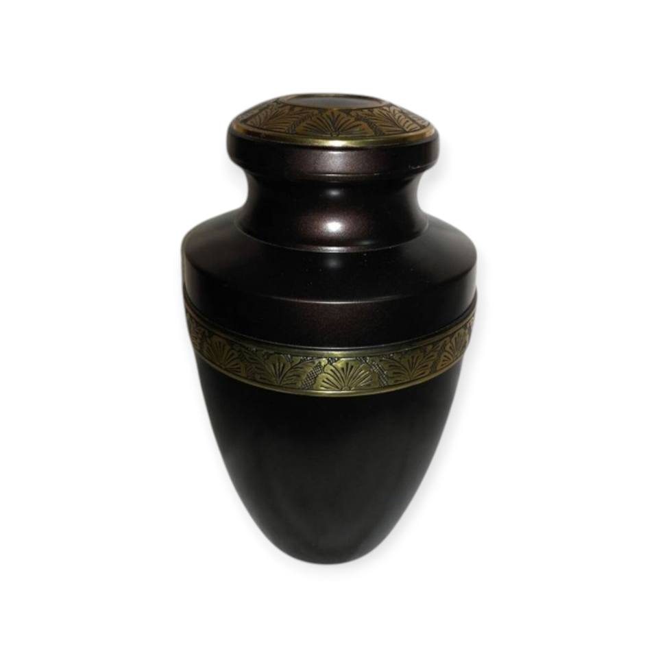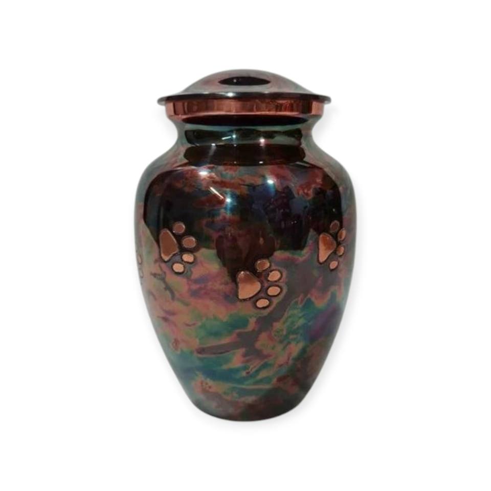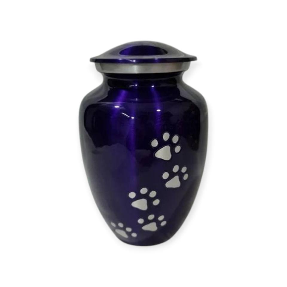 โกศใส่ของที่ระลึกสำหรับสัตว์เลี้ยงสีม่วงเข้มเงางาม พร้อมรอยเท้าสีเงินอ่อน สำหรับเป็นที่ระลึกสัตว์เลี้ยงที่รัก