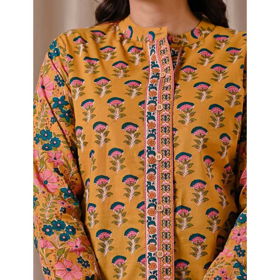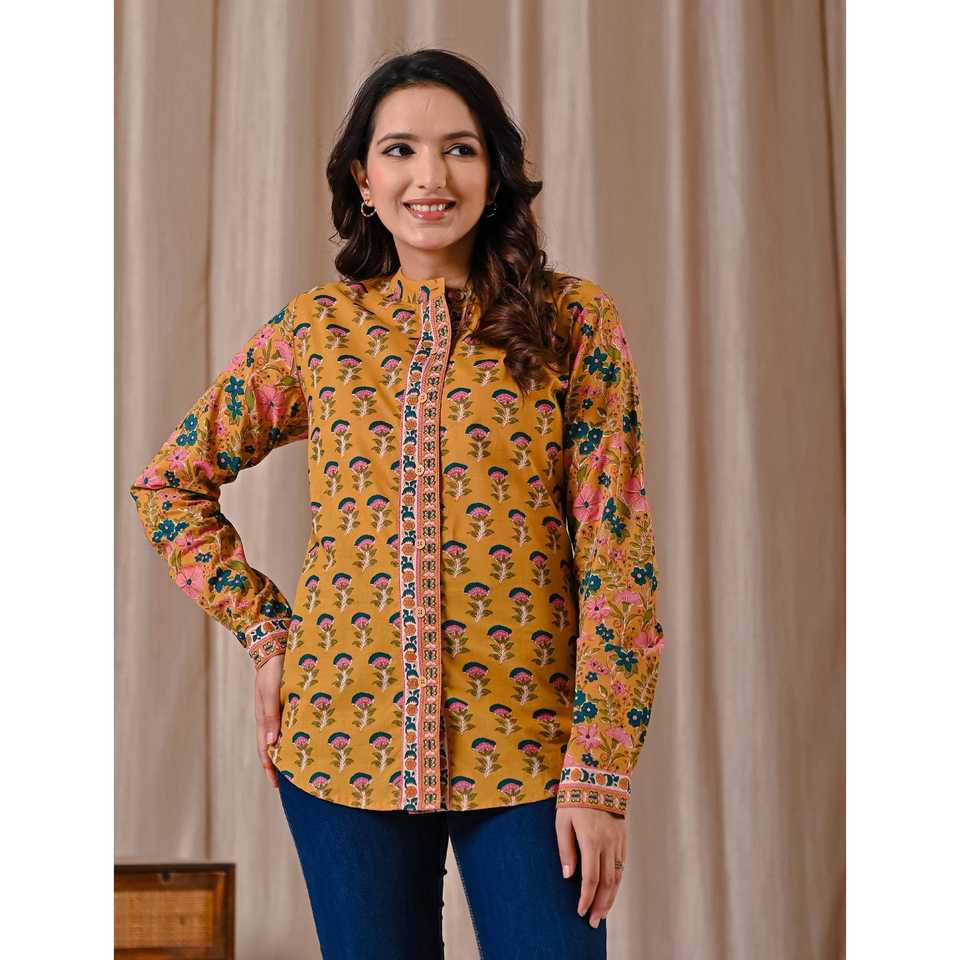 เสื้อท็อปผ้าฝ้ายพิมพ์ลายดอกสีเหลืองเข้ม ปักโลโก้ คอตั้ง ติดกระดุมด้านหน้า ไซส์ XL สำหรับใส่ทำงาน